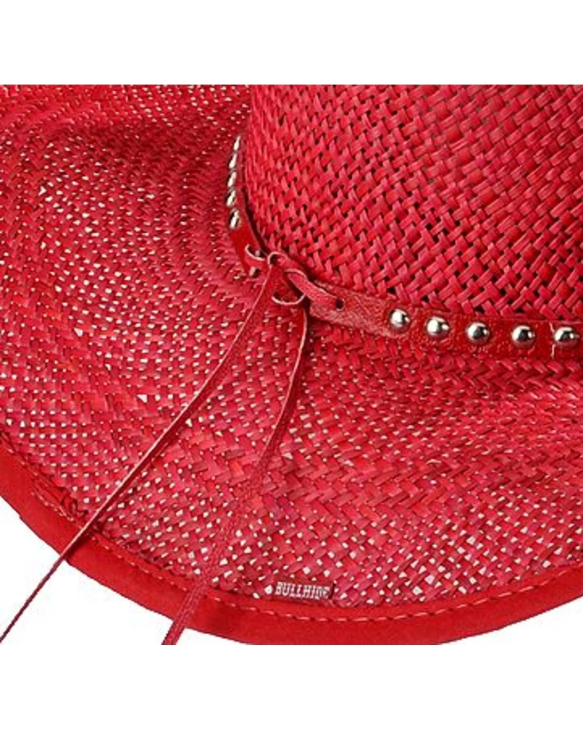 - Silver-tone studs & sparkly rhinestone flower adorn red leatherette hat band